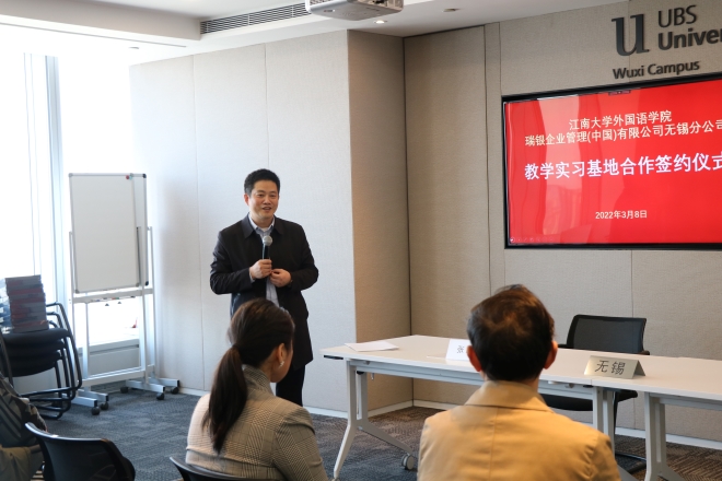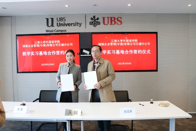 3月8日上午,江南大学江南在线学院与瑞银企业管理(中国)有限公司无锡分公司合作共建教学实习基地签约授牌仪式在瑞银无锡分公司恒隆总部举行。梁溪区组织部副部长王伟、江南在线学院院长方文开、学院调研员黄城芳、学院党委副书记刘伯贤、瑞银企业管理(中国)有限公司无锡分公司执行董事张晶等共同出席了签约仪式。