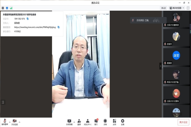 同日晚上,江南在线学院党委副书记刘伯贤召开了2021级本科生会议,刘书记号召大家积极高效地进行线上学习。面对疫情的严峻考验,同学们应服从疫情指挥要求,听从学校安排,及时测温上报。他还鼓励同学们多参加锻炼,保持良好的体魄和健康的精神状态。刘书记传达了学院关于教工党员联系宿舍的相关规定,逐一介绍了党员教工的情况,告知每位学生遇到思想、学业、心理、职涯规划等问题都可以咨询宿舍导师,鼓励学生加强与老师的沟通和交流。