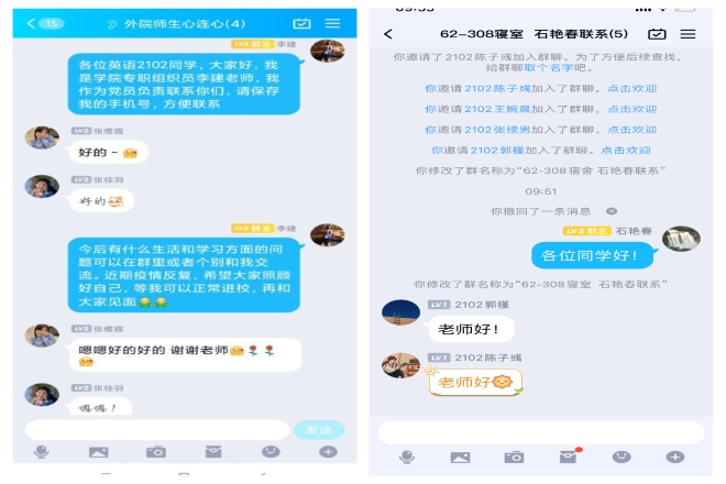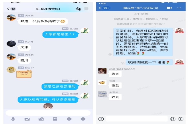 学院教工支部立即召开支部大会,发放联系清单,向每一位党员明确本次联系宿舍工作的职责和要求。当晚,学院48位教工党员迅速建立了54个包括混合宿舍在内的学生宿舍联系群,随即进行了首次线上交流。