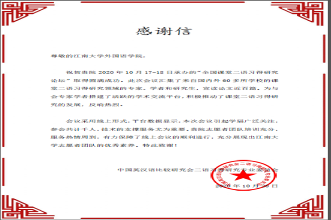在本次活动期间,志愿者们反应快速,服务到位,充分展现了我院志愿者团队的优秀素养,积极保障了本次二语习得论坛的顺利进行。会议结束以后,各个学校的专家、研究者们向江南大学的志愿者团队表示感谢。中国英汉语比较研究会二语习得研究专业委员会也向江南在线学院发来了感谢信,感谢学院和志愿者团队的辛勤付出。