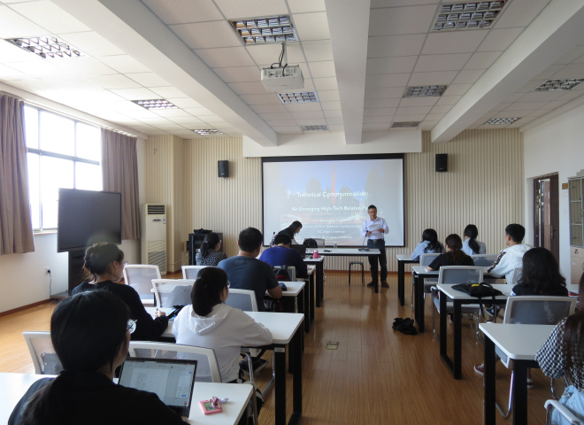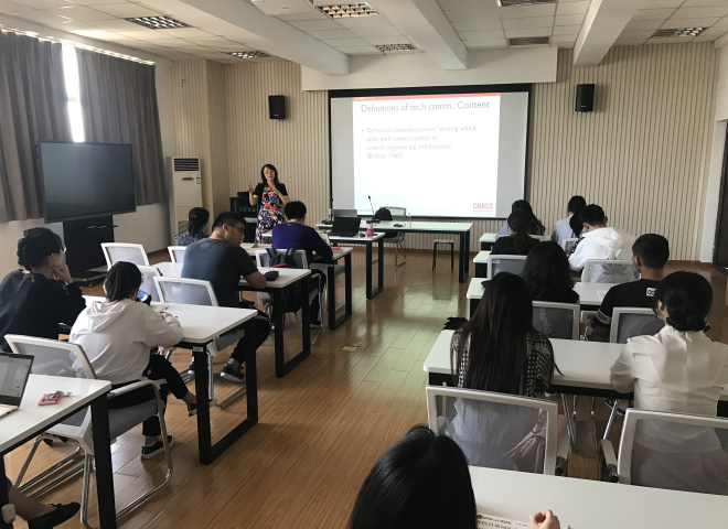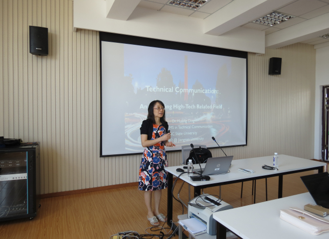 5月28日下午两点,2019外语学科系列讲座暨第六期“遇见更好的自己”名师沙龙活动在江南在线学院A529准时召开。本次活动由美国北卡罗莱纳州立大学(NCSU)英语系技术传播专业教授丁慧玲主讲。参加本次沙龙活动的有专业课老师及学院各年级本科生和研究生。本次讲座的主题是:技术传播:一个蓬勃发展的写作设计行业。