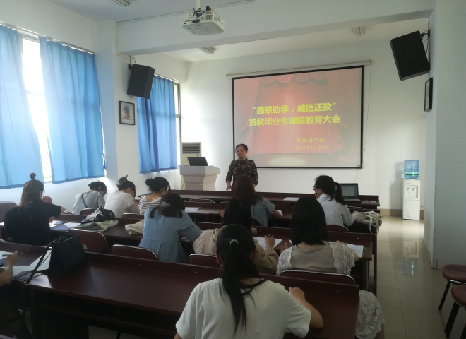 为充分发挥资助育人功效,培养毕业生诚实守信、知恩感恩的良好品质,结合学校《关于开展2019年江南大学学生资助诚信教育主题活动的通知》《关于开展国家开发银行生源地信用助学贷款2019届毕业生毕业确认工作的相关通知》的相关精神和要求,保证生源地信用助学贷款持续健康发展,引导大学生树立诚实守信的文明新风,5月29日上午10点江南在线学院在A433召开贷款毕业生诚信教育大会。毕业年级全体贷款学生参与了此次大会,会议由毕业班辅导员杨艳主持。