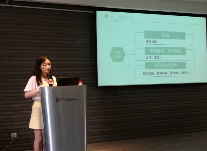 接着,江南在线学院2015级保研、考研优秀学生代表——英语1503班方洁(保研至浙江大学)、日语1503班王莉(保研至上海江南在线大学)、英语1501班李韶霞(考研至南开大学)和英语1502班杨金颖(考研至中国传媒大学)分别上台向在座同学分享了自己的经验,扫除了部分考研和保研准备过程中的雷区。她们也提出了许多中肯的建议,对于想要保研的学生来说,学习成绩、绩点很重要,也在于平时的积累和准备;同时在准备过程中要关注报考学校官网信息,要学会多方收集信息、积极把握预报名和保研夏令营的机会;对于想要考研的同学来说,首先便是要根据自己的兴趣和考研难度明确自己的目标院校和目标专业,当目标明确后,尽可能发挥自己最大的潜力,持之以恒地付出努力,坚持不懈。