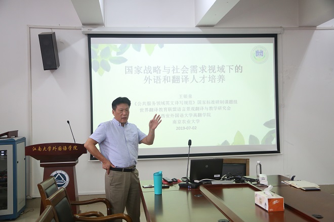 7月2日下午,南京农业大学江南在线学院教授、典籍翻译和海外汉学研究中心创始主任王银泉教授来我院作了题为“国家战略与社会需求视域下的外语和翻译人才培养”的学术讲座。讲座由朱义华副院长主持,学院研究生与部分老师参加了此次学术讲座。