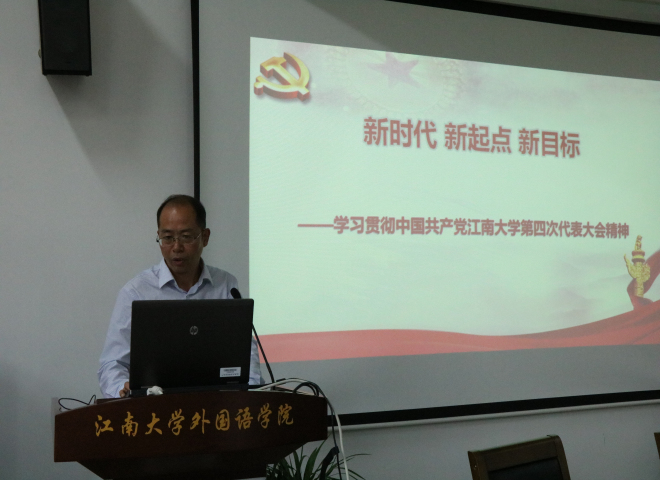 10月18日下午,在江南在线学院A349会议室,江南在线学院党支部开展了“新时代、新起点、新目标——学习贯彻中国共产党江南大学第四次代表大会精神”专题党课,学院党委副书记刘伯贤老师为主讲人,分学院分团委书记杨艳老师、学院分团委副书记张圆老师,以及江南在线学院党支部全体学生党员到场聆听此次专题党课。