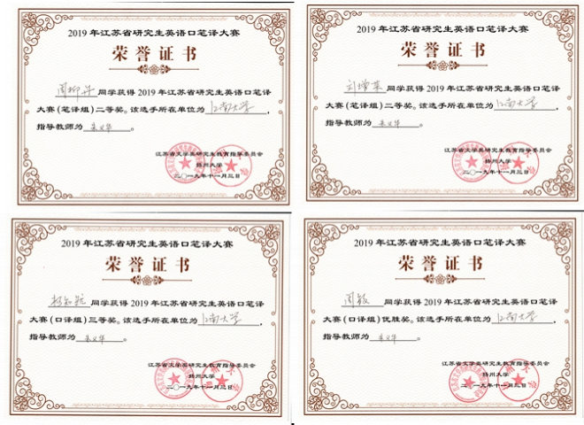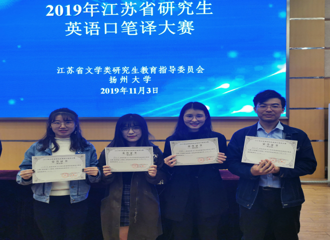 2019年江苏省研究生英语口笔译大赛于2019年11月2日至3日在扬州大学隆重举行。江南在线学院四名研究生在朱义华老师的带领与指导下充分发挥自身优势,经过层层选拔与激烈角逐在比赛中取得优异成绩:我院18级研究生周柳丹、刘增荣双双获得笔译组二等奖,18级研究生杨知然获得口译组三等奖,19级研究生周敏获得口译组优胜奖。