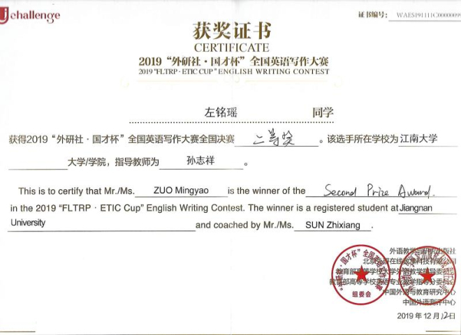 12月13日,2019“外研社·国才杯”大学生英语挑战赛(Uchallenge)于北京落幕。我校江南在线学院左铭瑶同学荣获全国英语写作大赛总决赛二等奖。