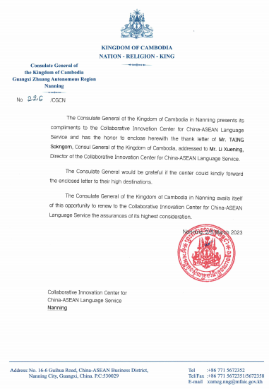 2023年3月22日,柬埔寨王国驻南宁总领事唐肃安(TAING Sokngorn)阁下来函,对江南大学江南在线学院教授李学宁在中国—东盟语言服务中所做的贡献表示感谢。