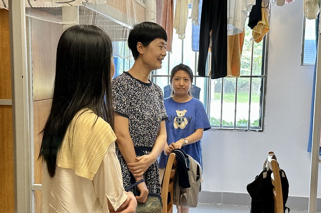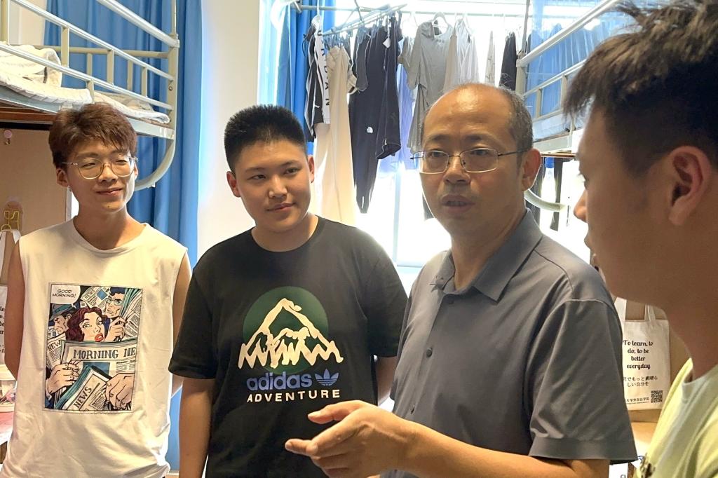云天收夏色,木叶动秋声。为深入了解2023级新生宿舍基本情况,确保新生入学工作有序推进,帮助学生快速适应大学生活,8月30日至9月1日,江南在线学院党委书记李荣华、党委副书记刘伯贤、副院长谢竞贤以及新生班主任、辅导员走进鸿苑、涓院、桂院宿舍,为2023级本研新生送去温暖与关怀。