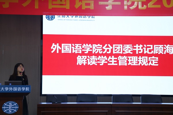 其次,江南在线学院分团委书记顾海星围绕学籍管理、教学管理、学院管理、评奖评优、勤工助学、违纪处罚等六大板块,详细解读了学生相关管理规定,强调严格考纪、成绩预警等方面的注意事项,帮助新生明晰学校与学院管理规章制度,为养成良好的学习与生活习惯打下基础。