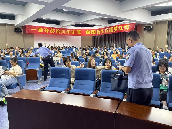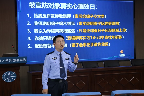 首先,由无锡市公安局滨湖分局雪浪派出所的杨恺警官进行新生防诈反诈安全教育。杨警官从电信诈骗、游戏诈骗、刷单诈骗、情感诈骗等四个方面,详细解读了各类诈骗行为,深入剖析宣防对象的心理独白,并通过生动形象的案例、有趣的互动问答,警示新生提高反诈意识,保护自己的财产安全,谨防诈骗。