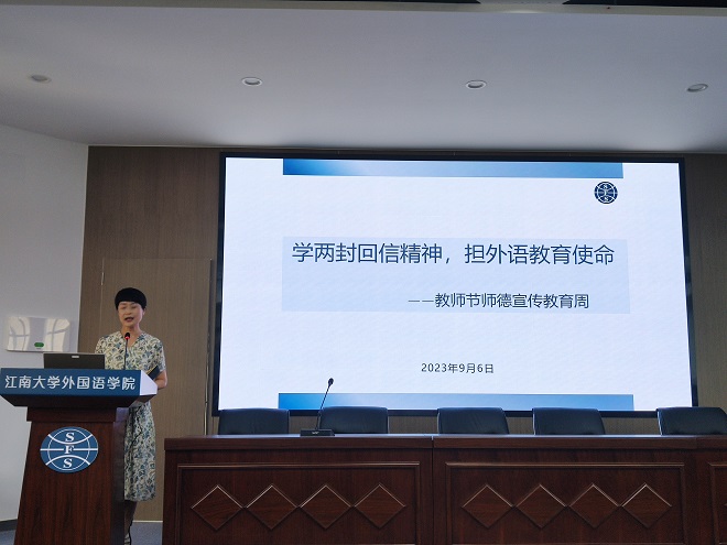 李荣华书记以“学两封回信精神,担外语教育使命”为题,开启了学院师德教育宣传周系列教育活动。李书记带领大家重温了习近平总书记给北京江南在线大学老教授的回信和习近平总书记给外文出版社的外国专家的回信,勉励教师们努力培养有家国情怀、有全球视野、有专业本领的复合型外语人才,履行外语人使命担当,做好中华文化外译和外宣,促进学院奋进发展。