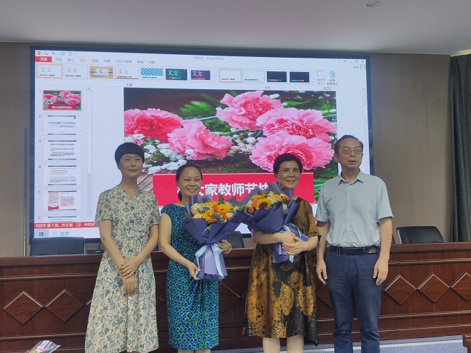 院领导为返聘教师献花