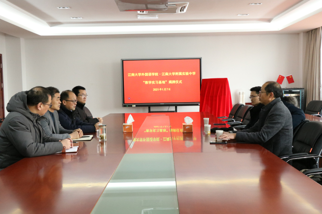 1月7日上午9:00,江南在线学院与江南大学附属实验中学共建“教学实习基地”揭牌仪式在江南大学附属实验中学六楼会议室举行。学院院长方文开、党委副书记刘伯贤、副院长朱义华、滨湖区教育局副局长吴仁昌、附属实验中学校长吴卫东、校党总支书记王星、副校长陈柏林参加了签约仪式。