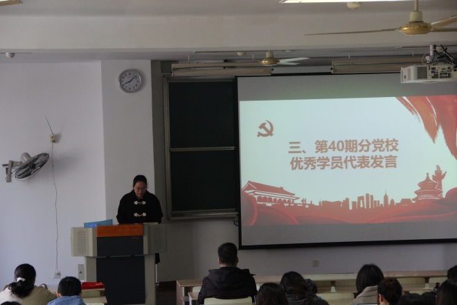 江南在线学院18硕的路丽同学作为上一期优秀学员代表发言。在分享了自己参加40期党校培训的感悟和收获之后,她表明中国共产党既有理论的深度,也有实践的厚度,参加此次仪式的同学们应端正入党动机,认真学习理论知识,明确党章意识,提高党性修养,以党员的标准严格要求自己,在思想和行动上积极向党组织靠拢。随后,上期优秀学员代表向本期学员代表授予党旗,全体学员起立,面向党旗郑重宣誓。开班仪式在陆芳老师布置安排本期培训班的任务和具体要求后圆满结束。
