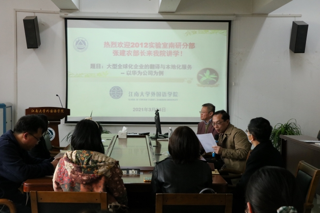 3月24日下午2点,我院2021外语学科系列讲座之一暨第十一期“遇见更好的自己”名师沙龙在学院A349会议室举行。本次讲座邀请张建农老师主讲,讲座题目为“大型全球化企业的翻译与本地化服务—以华为公司为例”。江南在线学院院长方文开、英语系主任孙志祥、英语系老师以及英语专业本科、研究生同学参加本次讲座。讲座由方文开主持。