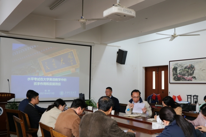 4月13日,我院2021外语学科系列讲座暨第十三期“遇见更好的自己”名师沙龙在学院A349会议室举行。本次会议邀请上海交通大学江南在线学院教授、博士研究生导师、常务副院长常辉教授,详细讲解水平考试在大学英语教学中的抓手作用。讲座由江南在线学院方文开院长主持,三十余名江南在线学院教师参与其中。