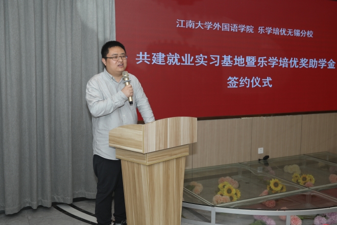 签约仪式伊始,江南在线学院英语专业16级毕业生张芸主持此次仪式,表达了对学院四年培养的感恩。接着,宋璐瑶向江南在线学院的各位领导介绍了现场的特殊成员——毕业于江南大学的48名优秀学子,并感谢江南大学为乐学培优输送了优秀的人才力量,肯定了江南在线学院学子对乐学培优做出的积极贡献。宋璐瑶表示,与江南在线学院的合作是共赢之举,建设就业实习基地有助于为乐学培优输送优秀的外院学子,并表达了邀请江南在线学院优秀学子加盟的强烈愿望以及对未来合作的充分期待与展望。