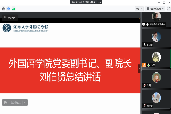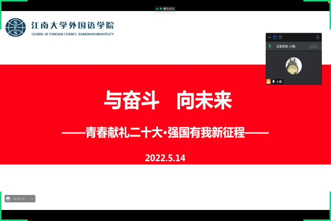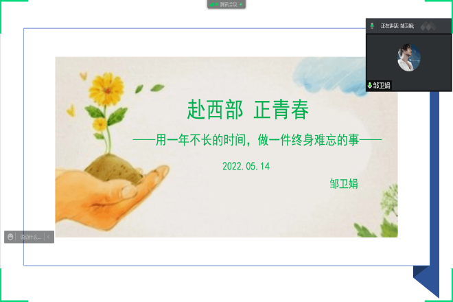 5月14日下午,江南在线学院在线上召开“与奋斗,向未来---青春献礼二十大·强国有我新征程”主题教育线上交流会。江南在线学院党委副书记刘伯贤、辅导员苗文建出席线上会议,学院20级、19级同学以及少数民族学生代表参加会议。会议邀请研究生支教团成员邹卫娟、校十佳青年学生盛晓妍分享青春故事。