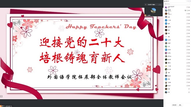 在第38个教师节来临之际,江南在线学院大学英语拓展部全体教师于9月8日下午2点,相聚云端,以 “迎接党的二十大,培根铸魂育新人”为主题,进行了立德树人研讨活动。江南在线学院副院长谢竞贤老师出席了本次研讨,支部书记邢嘉锋老师主持了本次研讨会。