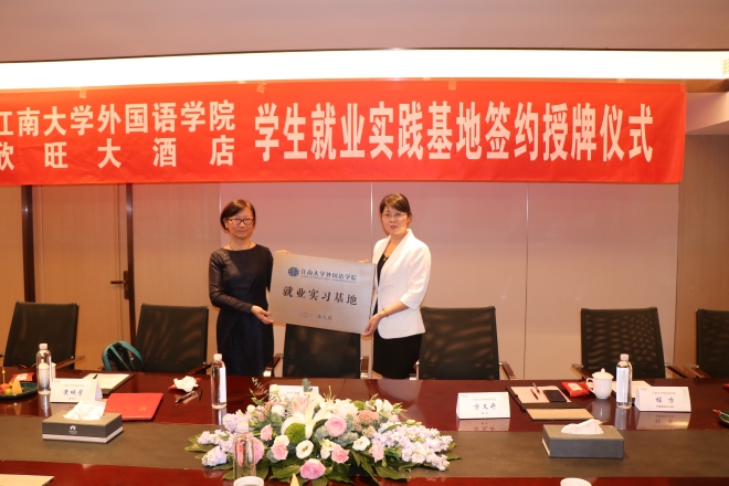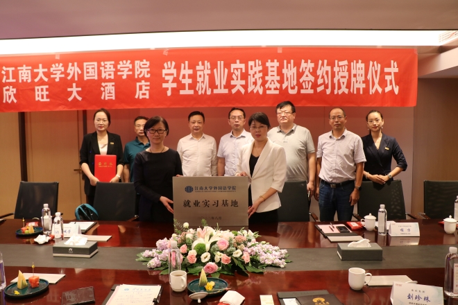 9月15日下午,江南大学江南在线学院与欣旺集团共建学生就业实践基地签约授牌仪式在欣旺大酒店举行。江南在线学院院长方文开、学院调研员黄城芳、学院党委副书记刘伯贤、学院副院长顾琦一、外语培训中心主任程方,欣旺集团董事长唐国忠、酒店总经理刘珍珠、酒店人力资源副总监张涛涛、董事长秘书吴洁等共同出席了签约授牌仪式。