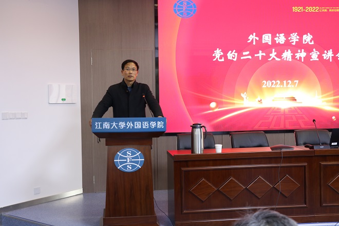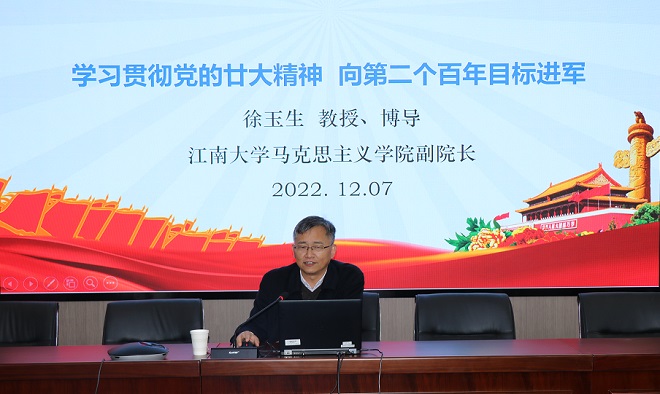 为全面深入学习领会党的二十大精神,扎实推进学习宣传贯彻工作,引导学院党员干部师生把思想和行动统一到党的二十大精神上来,江南在线学院邀请学校学习贯彻党的二十大精神宣讲团成员、马克思主义学院副院长徐玉生教授作题为“学习贯彻党的廿大精神,向第二个百年奋斗目标进军”的专题辅导报告。会议由江南在线学院党委书记史志洪主持。报告主会场设在学院君金报告厅,全院教工线上线下同步参加学习。