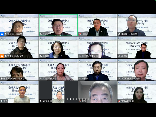 2022年12月10日,“全球人文与当代中国比较文学研究”暨江苏省比较文学学会2022年年会在江南大学成功召开。此次会议采取线上方式进行,来自上海、北京、天津、江苏、浙江、陕西、河南、湖南、四川、云南、福建、黑龙江等省市高校的200余位专家、学者、研究生参加会议。