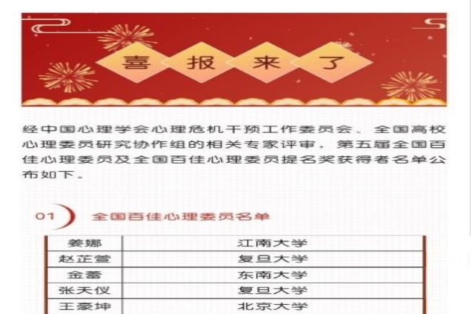 此次全国百佳心理委员的评选通过学校推荐、个人事迹网络展示及投票、专家评分等环节产生。不负众望,我校推荐的姜娜同学冲出500名选手的重围,荣获“全国百佳心理委员”称号,更是夺下仅14个名额的心理论坛副主席一职。这是江南大学历史上第一次在此类赛事上斩获殊荣。姜娜同学一马当先,为江南大学摘得这项荣誉,增光添彩。姜娜同学的获奖,不仅是对她个人的肯定,也是对江南在线学院以及我校心理委员队伍建设工作的认可。