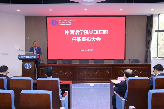 首先,顾正彪宣读了学校党委关于李荣华同志、方文开同志的职务任职决定,任命李荣华同志为江南在线学院党委书记,任命方文开同志为江南在线学院院长。顾正彪指出,此次中层干部的换届调整,是学校干部任职目标责任制的例行工作,也是优化班子结构、促进改革发展的一项重要举措。他对学院上届班子的工作给予高度肯定,并对新一届领导班子提出工作希望。第一,要旗帜鲜明讲政治,学院领导班子一定要把讲政治作为立身之本,坚持社会主义办学方向,坚持立德树人根本任务,强化党政同责、一岗双责意识。第二,要敢于担当善作为,抢抓发展机遇,紧扣国家战略和学校发展,持续提升大学英语对学校“双一流”建设和人才培养的贡献度,进一步拓展专业硕士学位点建设,设立二级博士点。要根据国家和学校发展战略,积极探索建设具有鲜明特色的英语和日语专业。第三,要团结协作聚合力,提高班子战斗力,牢固树立“一盘棋”思想,围绕中心工作,密切配合,通力协作。第四,要以身作则当表率,从严治院,从严立职,从严带队伍。