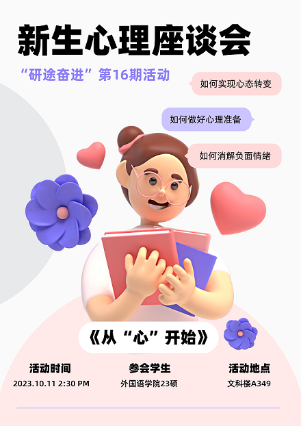 10月10日是第32个世界精神卫生日,为进一步开展心理健康教育工作,促进江南在线学院研究生新生的成功转型,帮助2023级研究生开好头、起好步,2023年10月11日下午15点30分,江南在线学院“研途奋进”第十六期活动在文科楼A349成功举行。2023级全体硕士研究生及部分2022级硕士研究生参与了本次活动。此次活动的主题是“从‘心’开始”新生心理座谈会,共分为两个环节:学姐经历分享以及趣味心理小测试。