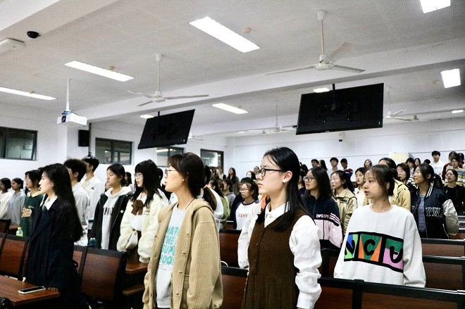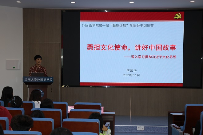 结营仪式于11月1日下午在君金报告厅举行。江南在线学院党委书记李荣华、党委副书记刘伯贤、分团委书记顾海星以及辅导员朱家烨出席了本次活动。李荣华首先以“勇担文化使命,讲好中国故事”为主题,为同学们讲党课、强信念。她强调,作为新时代的外语人,要拓宽眼界,培养敏锐的洞察力,树立文化自信,传播国际声音,讲好中国故事。随后,顾海星为本次培训评选出的4组“优秀营员”颁发证书。最后,刘伯贤致辞。他指出,在座的学生骨干都是江南在线学院的栋梁之才,希望同学们能够珍惜来之不易的培训机会,努力学习知识技能,在江南在线学院的舞台上发光发热!