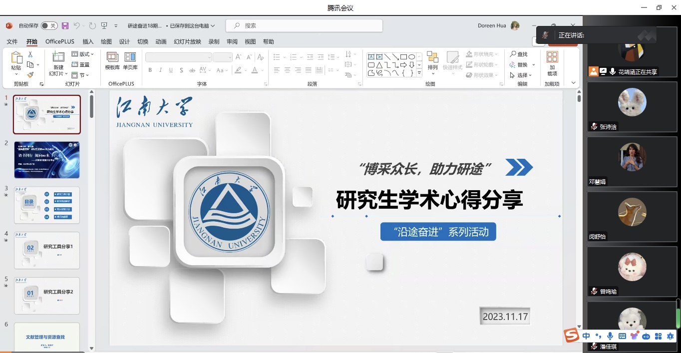 2023年11月17日19:00,江南在线学院“研途奋进”第十一期活动在腾讯会议平台成功举行,本次活动主题为“博采众长,助力研途”学术生活心得分享会。22、23级硕士研究生线上参与了本次活动。
