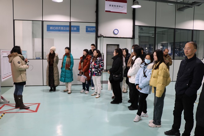 第二站,学院师生来到了江苏赛迪乐科技集团。该企业是一家专注于手动、电动、光伏电控内置遮阳百叶中空玻璃研发与制造的国家高新技术企业、“专精特新”小巨人企业,在海外建材市场占有可观的市场份额。李荣华充分肯定了赛迪乐先进的设计研发、生产制造和检验检测,详细了解公司的人才需求及招聘计划。赛迪乐方也表示,希望未来可以与我院进一步加强院企交流,建立长期稳定的合作关系,积极探索多种产教融合方式。