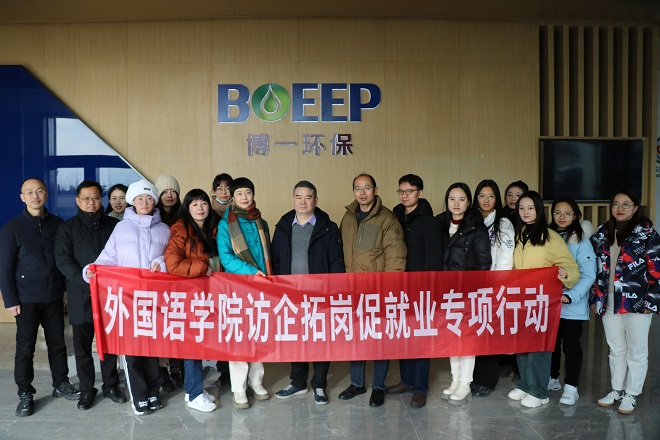 活动第一站,学院师生来到扬州环保科技产业园,参观江苏博一环保科技有限公司。博一环保是国内环保行业细分市场上知名度高、应用量广、用户满意的品牌。走访过程中,师生了解到,公司高度重视技术创新与生产质量,销售网络遍布全国并远销欧洲、美洲和东南亚等多个国家和地区。负责人提到,由于与国际客户对接联系的需求不断增加,公司对于外语人才的需求也逐步提高。李荣华表示,江南在线学院致力于培养具有全球视野、熟练运用外语、晓通国际规则的新时代外语人才,希望能够加强与企业的交流协作,发挥各自优势,打造具有江南在线学院特色的校企合作模式。