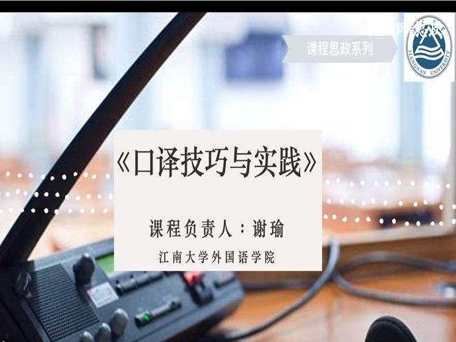 《口译技巧与实践》是英语专业核心课,江南大学课程思政示范课程,江南大学“至善课程”。课程以理论为基础,侧重技能培养,教学过程中以口译基础技能为主线,配合语言素材、专题知识输入、多样化的训练形式和任务,设置情景演练,提升口译专项技巧,为培养高素质、应用型英语专业人才服务。