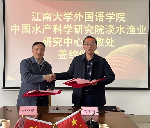 3月14日,丝丝春雨中,江南大学江南在线学院迎来了中国水产科学研究院淡水渔业研究中心国教处敬小军处长、处长助理叶伟等一行。在经历了两个多月的接洽后,双方协定共建合作平台,并举行签约仪式。江南在线学院方文开院长、刘伯贤副书记、英语系主任杨勇教授代表学院参加了签约仪式。