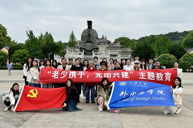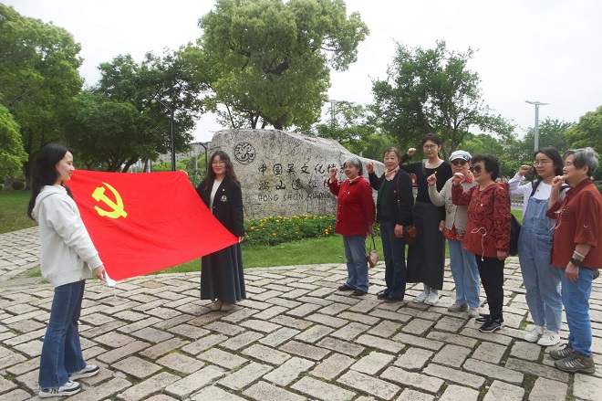 党旗所指就是团旗所向。为鼓励新时代中国青年团结凝聚在党的周围,以昂扬向上的精神风貌在中国式现代化建设中挺膺担当,坚定青年党员和团员听党话、跟党走的决心,4月27日,机关离退休第三党支部、社桥离退休党支部的部分老党员与江南在线学院英语本科生党支部党员、雷锋特称团支部、张闻天特称团支部团员,赴无锡泰伯陵以及鸿山遗址博物馆联合开展“老少携手,党团共建”主题实践活动。