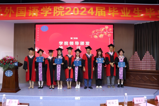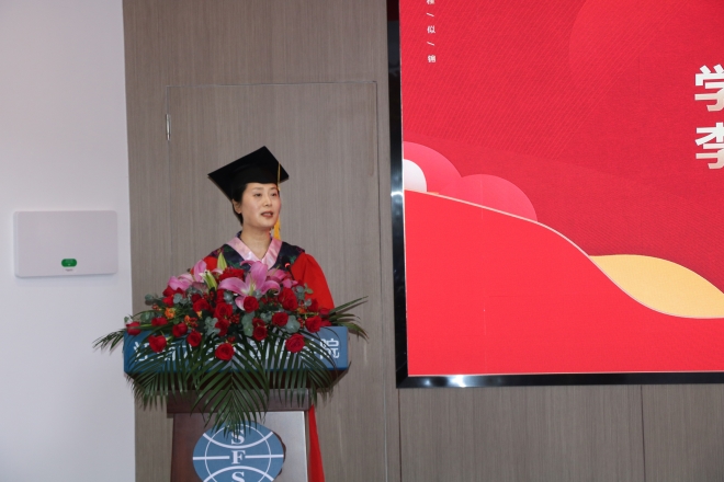 接下来,江南在线学院党委书记李荣华发表毕业寄语。首先,李荣华对毕业生们表达了真挚的祝福,对老师和家长们表示了衷心的感谢。随后,他回顾总结了外院2024届学子一路走来的成长与收获,赞扬了大家砥砺奋斗取得各项成绩。最后,李荣华分享三点:致知,做深学笃行的学习者;致行,做知行合一的践行者;致远,做创新有为的奋进者。寄语大家:肩负时代使命,提升专业本领,涵养家国情怀,形成全球视野,努力成为又红又专又雅的外语人,奋力书写为中国式现代化挺膺担当的青春篇章!
