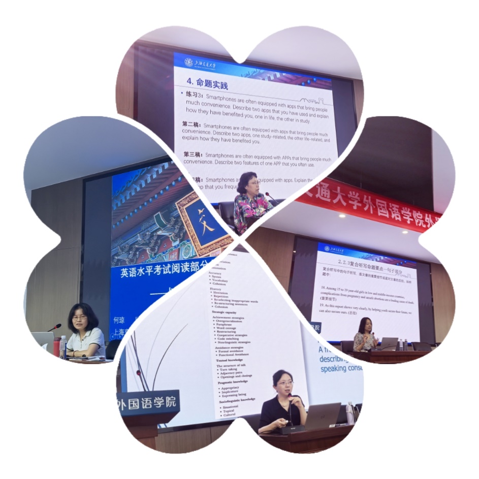 上海交大英语水平考试命题组陆元雯老师的分享聚焦于写作部分的命题理念、评阅标准及命题实践,她详细解析了如何设计能够真实反映学生写作能力的题目,并提供有效的评阅标准与方法指导。语言测试专家张琳博士就口语测试的命题原则及方法进行生动阐释,在交互性研讨中,她突出口语交流能力的重要性以及如何在测试中准确评估这一能力。遵循口语考试设计六大原则,以非交互式题型为例分析常见题型及编写原则以及试题审核。水平考试阅读组和口语组骨干成员何琼博士以阅读部分为例,说明如何通过阅读材料的选择和题目的命制来保证阅读理解测试的有效性,包括阅读部分设计理念和命题原则、选材标准和试题命制流程。命题组另一骨干成员张菁博士就听力部分的基本测试原则、试题设计及选材原则等分享独特经验,包括任务设计、各题型命题要点和命题质量管理,尤其深入分析了如何通过阅读材料的选择和题目的命制保证听力测试的有效性。