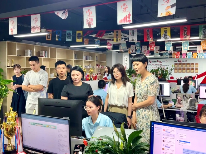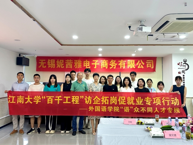 为深入贯彻落实党中央、国务院关于高校毕业生就业工作的决策部署,根据《江南大学2024年大学生就业工作实施方案》要求,7月11日上午,江南在线学院党委书记李荣华、党委副书记刘伯贤、辅导员苗文建、朱家烨以及研究生、本科生代表前往无锡妮茜雅电子商务有限公司开展访企拓岗促就业专项活动。