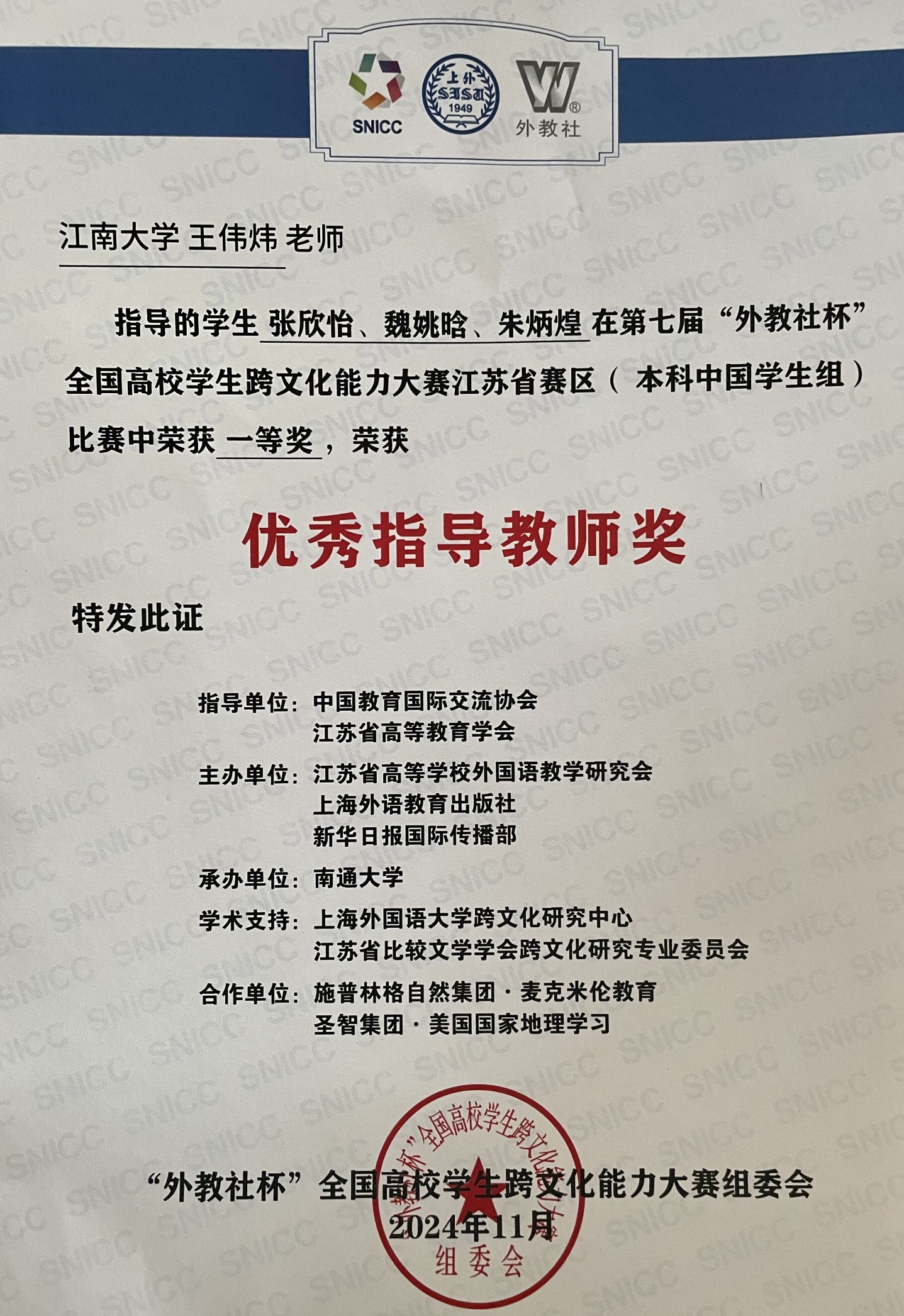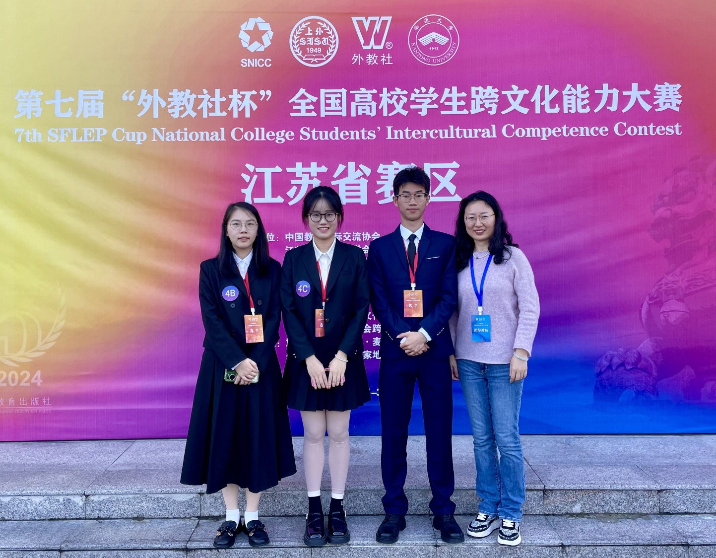 2024年11月1日至3日,第七届“外教社杯”全国高校学生跨文化能力大赛江苏省赛区比赛在南通大学成功举办。比赛分为本科中国学生组、高职中国学生组和国际学生组三个赛道,其中本科中国学生组共有包括来自南京大学、东南大学、南京理工大学、南京医科大学等43所高校的43个团队。经过激烈角逐,由我校江南在线学院张欣怡、人文学院魏姚晗和生物工程学院朱炳煌组成的团队在指导老师王伟炜的带领下顺利晋级江苏省赛区决赛并最终荣获江苏省赛区一等奖。这是我校学子在此项比赛中继去年荣获省赛一等奖后的再次丰收。