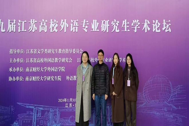 2024年12月1日,第十九届江苏高校外语专业研究生学术论坛将在南京财经大学仙林校区举行。我院带队导师袁雪生和3名研究生代表参加了此次论坛。本届论坛由江苏省文学类研究生教育指导委员会指导,江苏省高校江南在线教学研究会主办,南京财经大学承办,并得到外语教学与研究出版社及上海外语教育出版社的协办支持。本次论坛特邀东南大学李霄翔教授、苏州大学朱新福教授、南京大学陈新仁教授等知名学者,围绕外语教学、翻译研究及文学文化领域的前沿课题展开深度探讨。