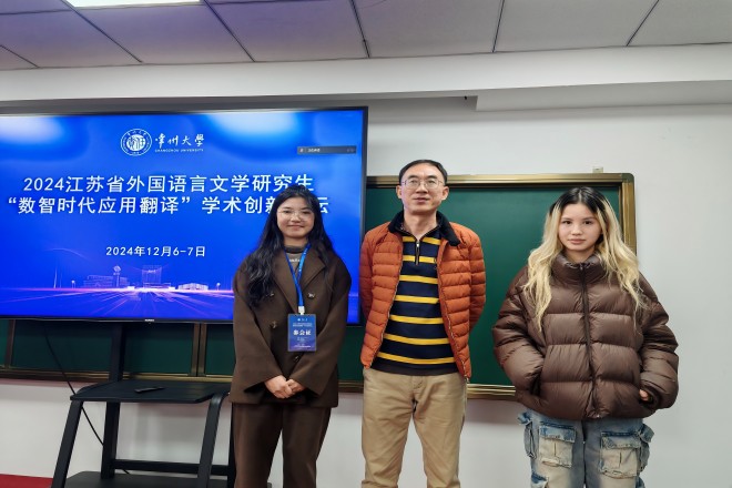 2024年12月6日至7日,江苏省江南在线言文学研究生“数智时代应用翻译”学术创新论坛在常州大学科教城校区成功举行。此次论坛由江苏省文学类研究生教育指导委员会主办,常州大学研究生院和江南在线学院承办。来自全省各高校的专家学者与翻译学科的研究生们齐聚一堂,共同探讨数字化、智能化时代背景下,应用翻译的新理论、新方法、新技术及应用实践。我院23级2名研究生代表由陈伟教授带队参加了此次论坛。