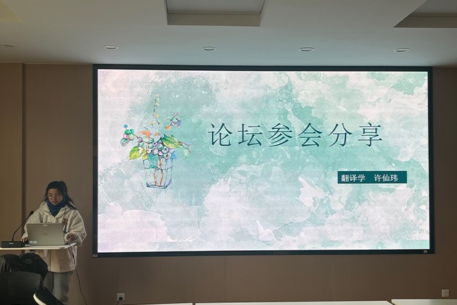 活动特邀来自研二、研一的三名优秀学生,他们分别从文学、语言学、翻译三个方向进行专题分享。首先,研二文学方向的严陈晨同学分享了她的获奖论文,并分析了如何从选题到最终展示、不断打磨论文以及参与论坛后的学术提升心得,为同学们提供了实操性的指导。