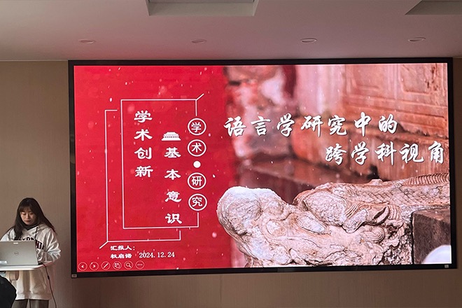 紧接着,研一语言学方向的权启诺同学分享了“语言学研究中的跨学科视角”。她结合自己参加2024年江苏省“数字化时代跨学科研究与发展”学术创新论坛的经历,分享了自己是如何将跨学科视角融入语言学研究,并展示了参会论文中使用的分析工具和展示逻辑,帮助同学们直观了解科研与学术论坛的结合点。