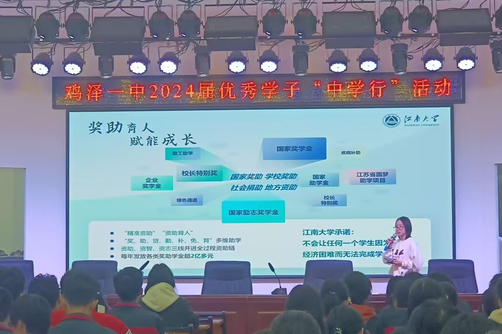在“资助政策校园行”活动中,学生资助宣传大使们深入高中母校,采取多种形式介绍了我校办学特色、学科优势、校园文化及大学资助政策体系,足迹遍布江苏、安徽、浙江、重庆等多个省市。英语2301鲍润怡、日语2301李汭芃、李诗涵、周宇静等同学踏入母校教室,借助多媒体演示、视频展播及特色文创产品展示等多样形式,为学弟学妹们详细介绍了我校的资助政策体系。英创2402刘怡念以“让江南大学资助政策走进校园”为主题,在母校报告厅为高一、高三年级的学生带来了两场风格不同的宣讲。面向高三学子,宣讲内容简明扼要,为即将面临高考的他们提供了有力的信息支持;面向高一学子,宣讲内容则充满趣味,以生动的方式让同学们提前了解大学的资助政策,感受江南大学的人文关怀。日语2301刘加顺在母校的中央区域精心布置摊位,树立醒目立牌,向学弟学妹们发放资助宣传册,并一对一咨询交流,耐心解答他们的各种疑问,用真诚和热情传递着资助政策的温暖。学生资助宣传大使们还积极配合家乡所在地县级资助管理中心或乡镇办事处,协同开展“冬日送温暖”等系列活动,将国家资助政策的温暖送到千家万户。英语2402牟依诺投身于“真爱到家·情暖夕阳”关爱孤寡老人志愿活动,为老人打扫房间,陪他们聊天解闷,送上生活物资。