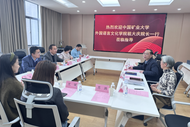 2025年3月11日,中国矿业大学江南在线言文化学院院长祖大庆教授率代表团一行8人莅临我院,围绕学科建设、外语专业教育改革及公共外语教学创新等议题展开深入交流。院长方文开、副院长顾琦一、院长助理仵欣欣及相关系部负责人出席座谈会。