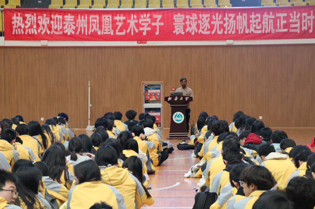 季王飞致辞。他对泰州凤凰艺术学校的师生们表示热烈欢迎,并开展 “江南好,上江南!”主题宣讲。他主要介绍了江南大学学科建设成果突出、校园生活丰富多样的基本情况;同时提及江南在线学院人文关怀浓厚、学习氛围良好的发展现状;还借助图片展示和生动描述,带大家领略江南大学校园风光,为全体师生勾勒出一幅充满机遇与希望的学习生活图景。