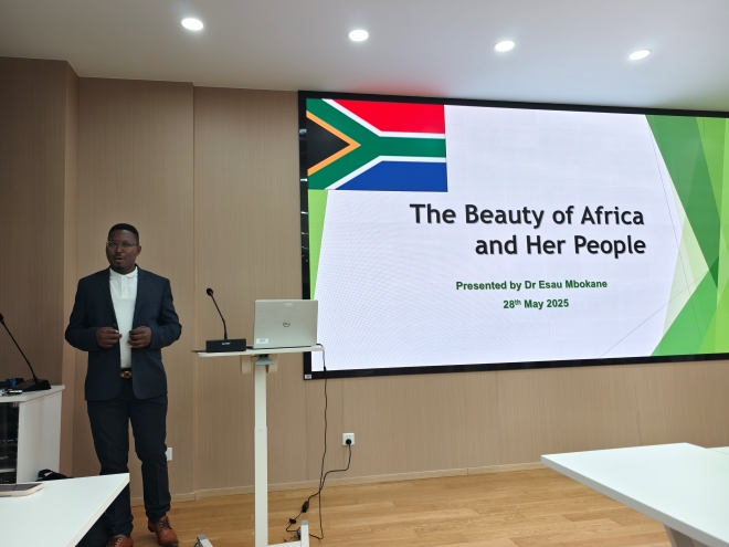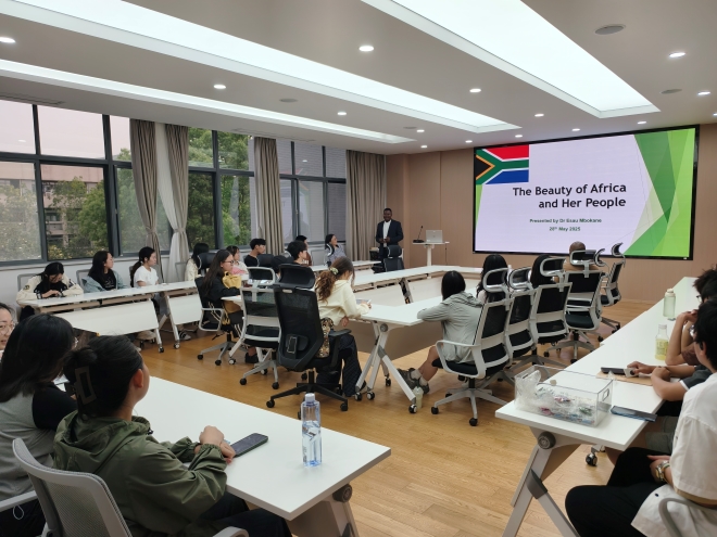 5月28日晚,南非林波波大学农业与环境科学学院高级研究员埃绍·马修斯·姆博卡内博士(Dr. Esho Mathews Mbokane)来到江南在线学院,以“Dialogue with World’s Diverse Cultures—Exploring South Africa”为主题开展学术讲座。江南在线学院副院长顾琦一参加讲座,讲座由学院曹丹老师主持,外院师生五十余人参与了本次讲座。