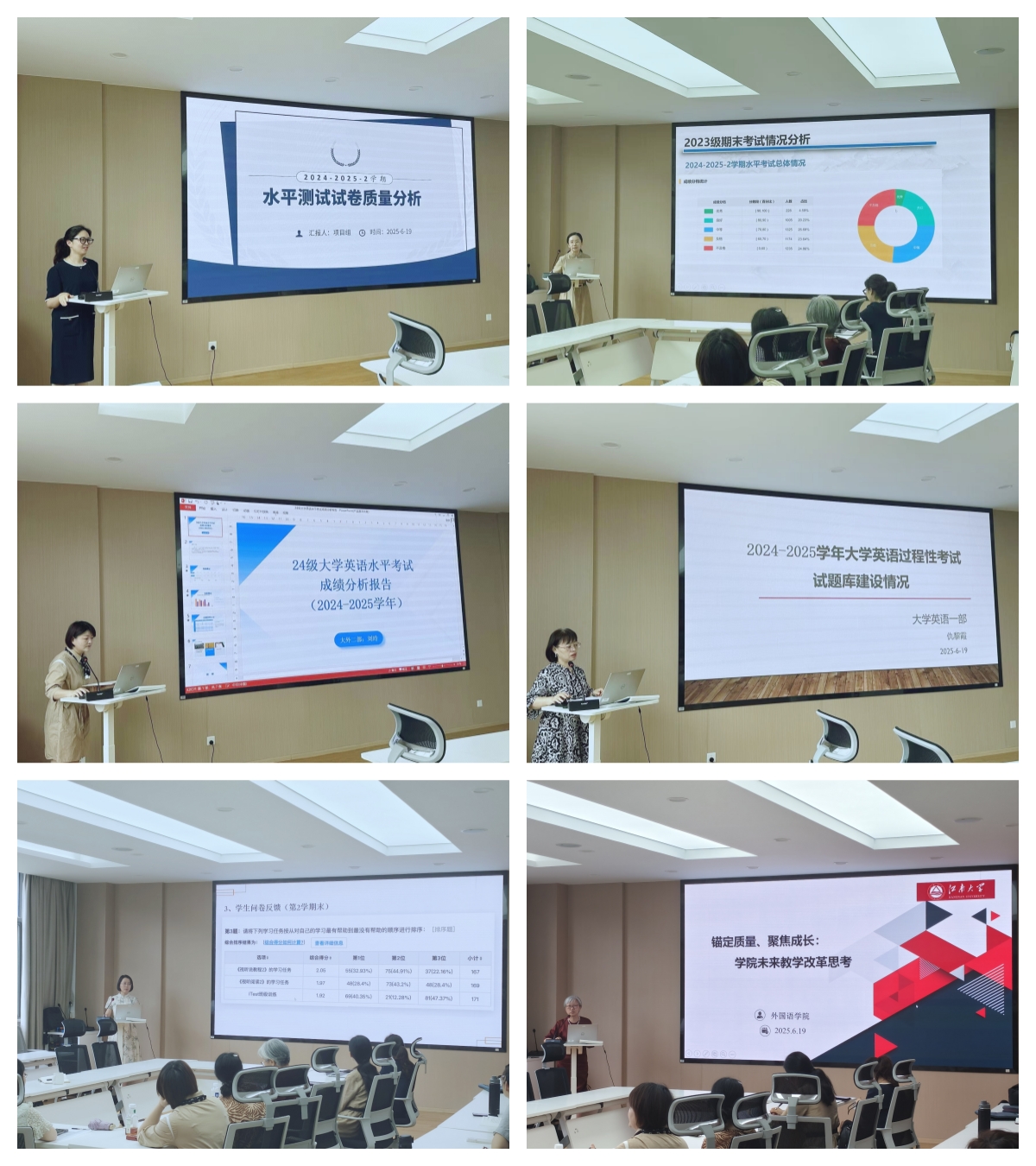 大学英语一部主任宣泠老师、二部主任刘玲老师分别汇报了期末考试情况。总体来讲,23、24级学生成绩都呈正态分布且呈现波动上升趋势,反映了师生“探索-调整-突破”的英语学习动态成长过程。